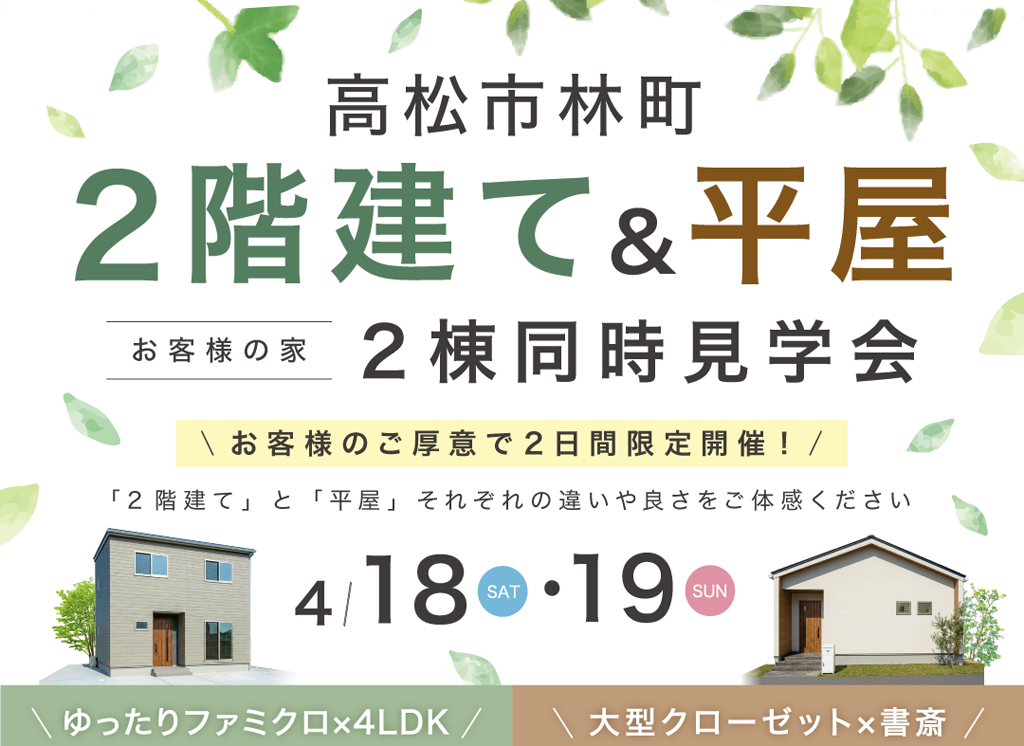 | タイトル | 【高松市林町】2階建て&平屋 お客様のお家 同時内覧会 |